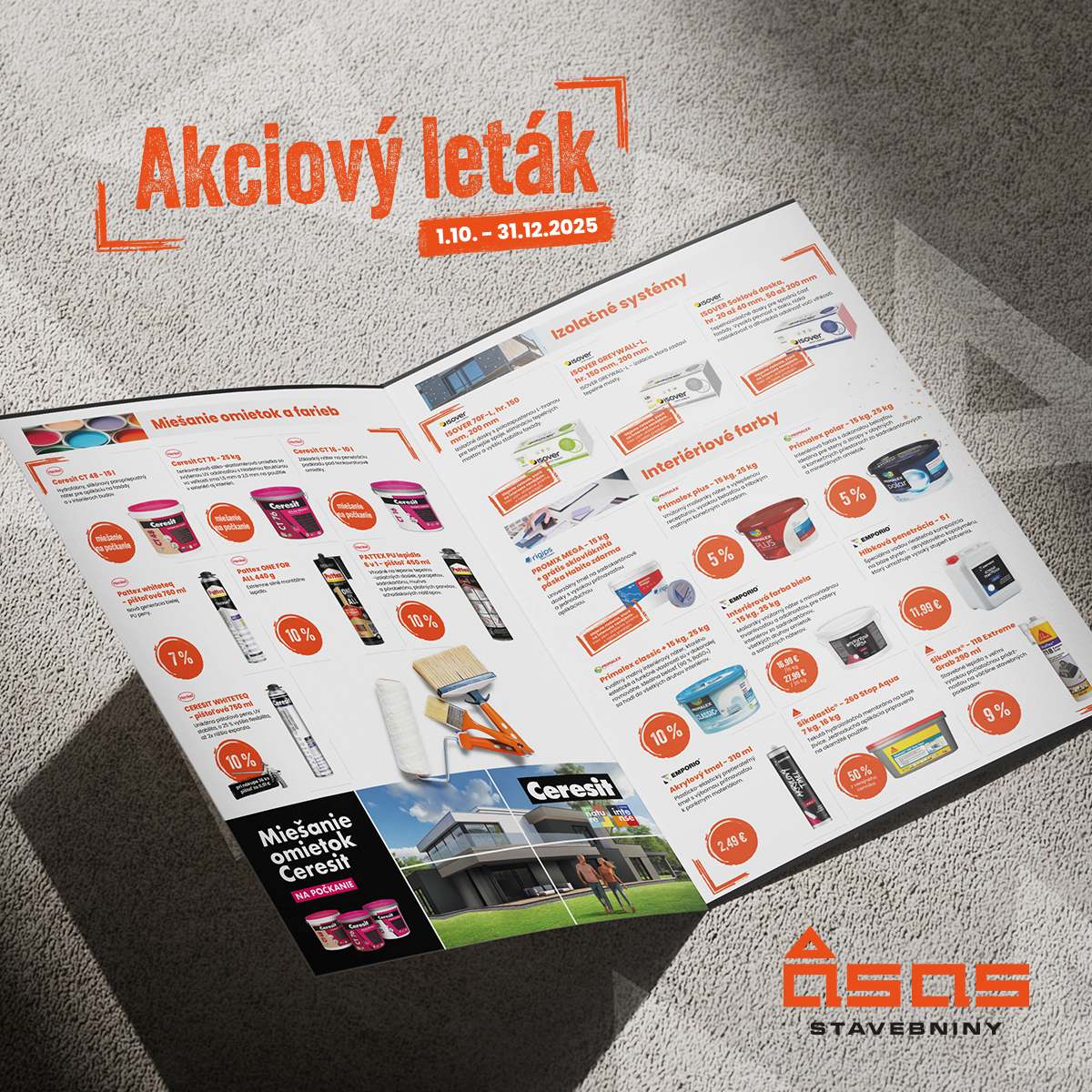 Sieť ASAS Stavebniny prichádza s novým akciovým letákom, ktorý platí od 1. októbra do 31. decembra 2025. Aj tentokrát sme pre vás pripravili široký výber produktov a služieb za výhodné ceny.