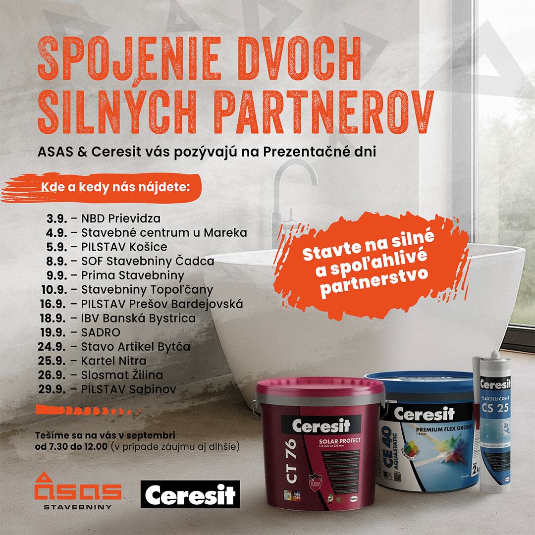 Leto síce pomaly končí, ale u nás v stavebninách to bude ešte poriadne horúce – prebiehajú Prezentačné dni ASAS & Ceresit! Práve vďaka tejto spolupráci čakajú na vás produkty, odborné poradenstvo a nové inšpirácie, ktoré vám pomôžu posunúť vaše projekty na vyššiu úroveň.
